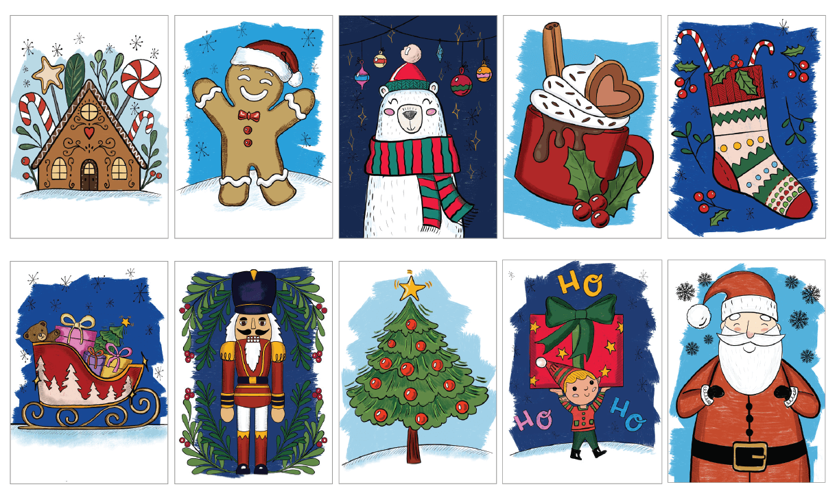 There's something magical in the air that inspires me to create illustrations that capture the joy and spirit of the season. When I sat down to begin my Christmas illustrations, I started by thinking about the memories I have from my own childhood. I remember the excitement of decorating the tree with my family, the delicious smells coming from the kitchen, and the anticipation of opening presents on Christmas morning. These memories inspired me to create 10 different Christmas illustrations that hopefully will evoke those same emotions in others. It's a privilege to be able to create something that can bring happiness and warmth to others during the holiday season. I hope that my illustrations can help others capture the same magic and wonder that I feel during this special time of year.”