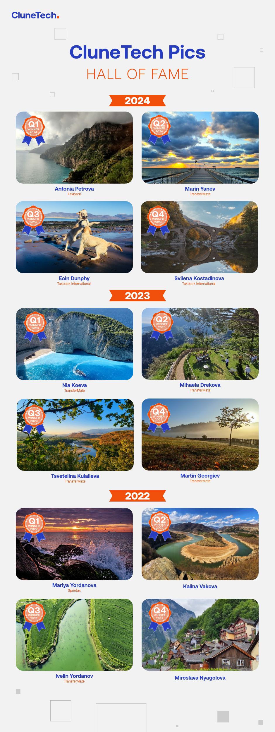 Finally, to properly recap the year, we're excited to share the full gallery of winning photos from all past editions of the CluneTech Pics competition. We're sure you'll be amazed by the stunning, professional-quality shots taken by our talented colleagues. If you're curious about the story behind each photo, head to our Newsletter Library, where you can find short interviews with all our winners so far.